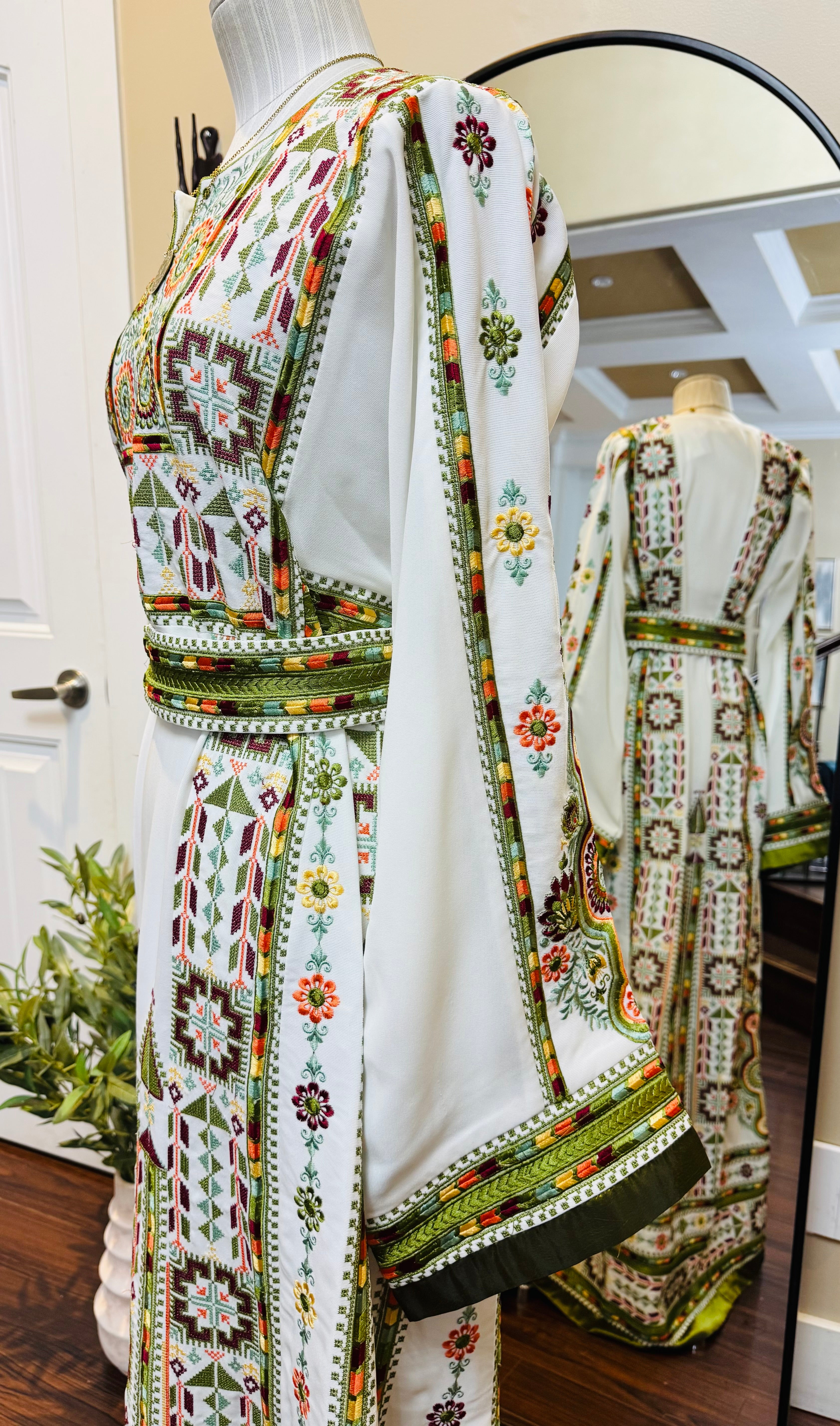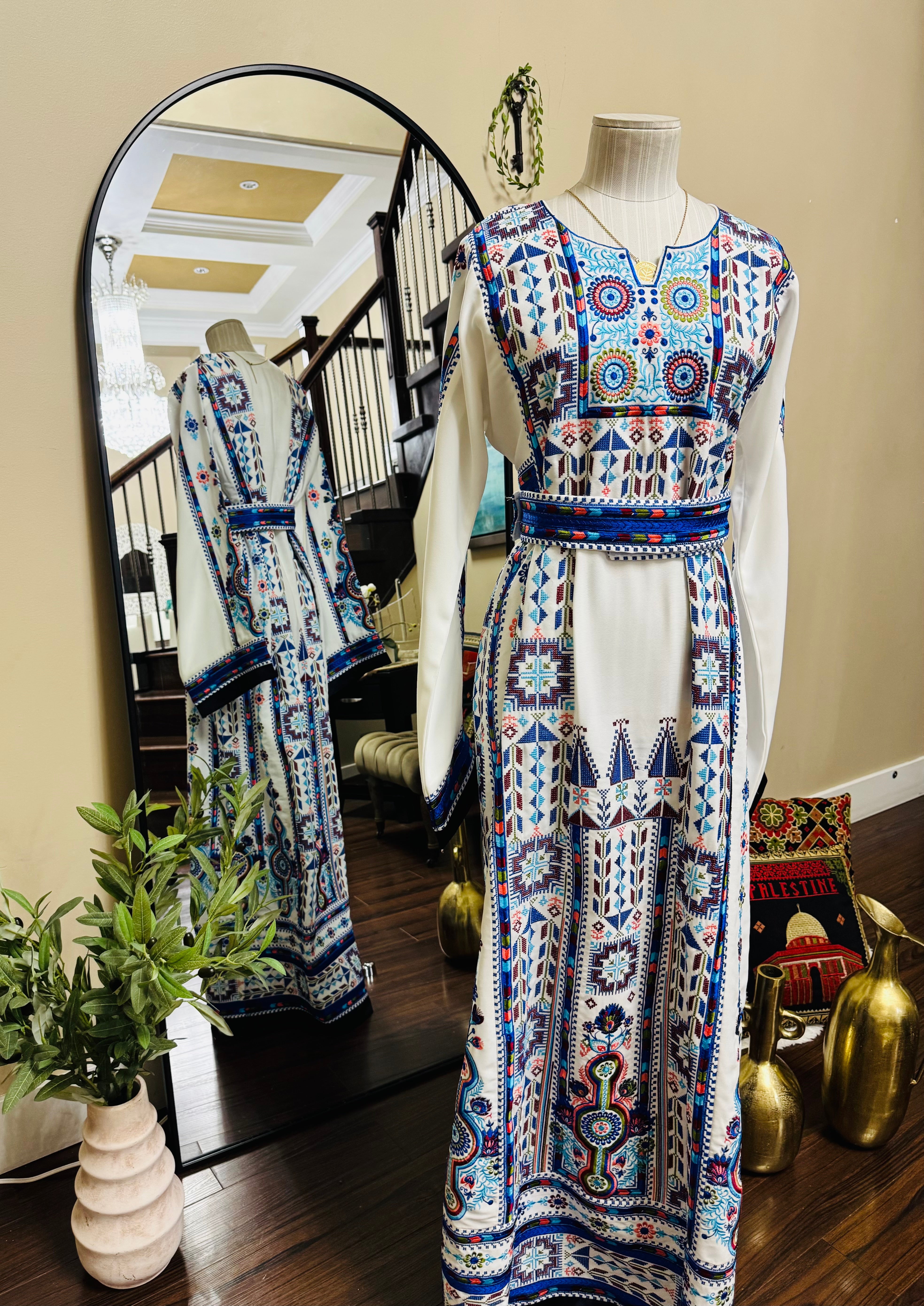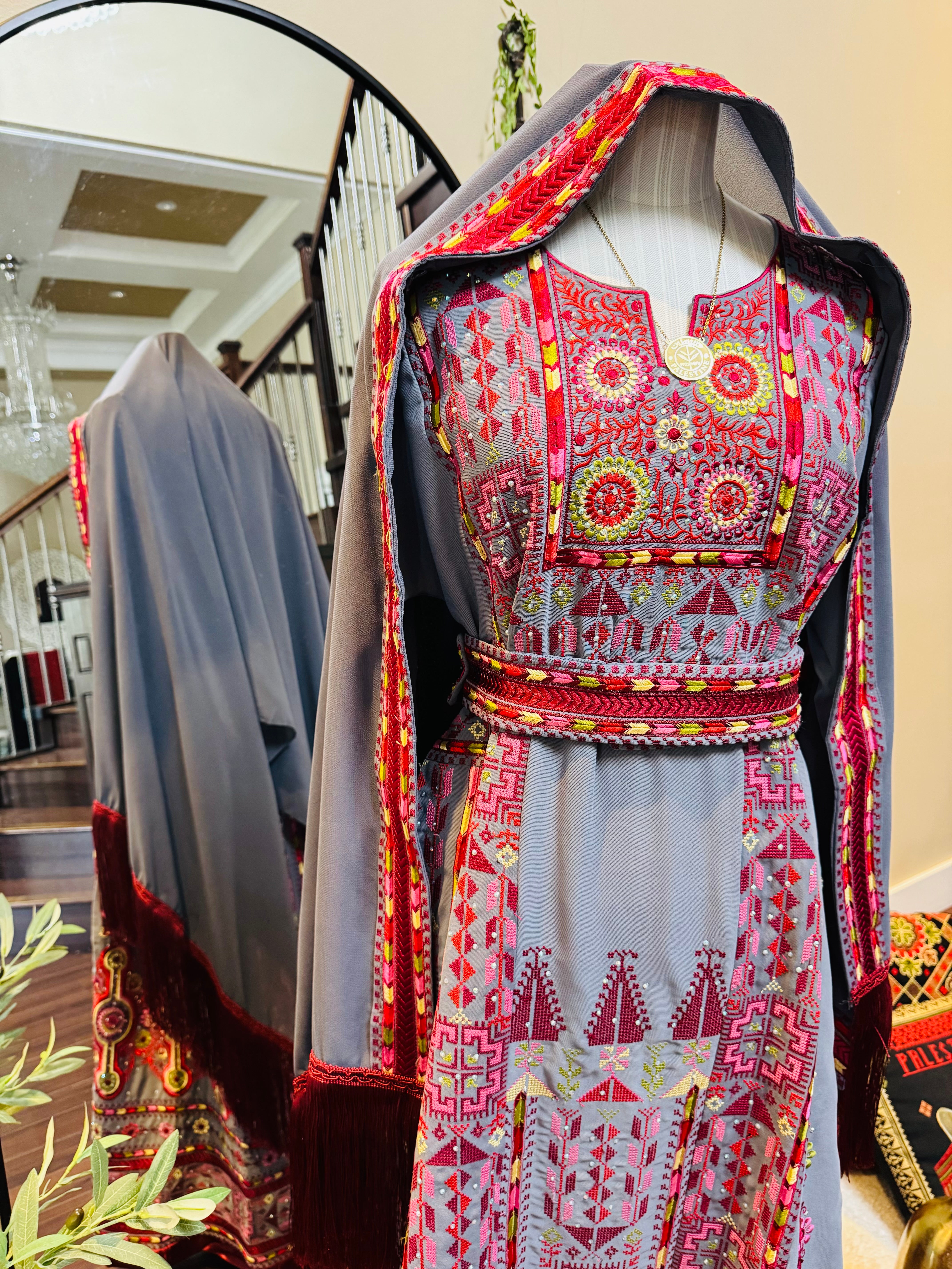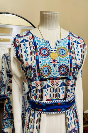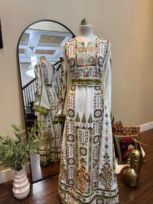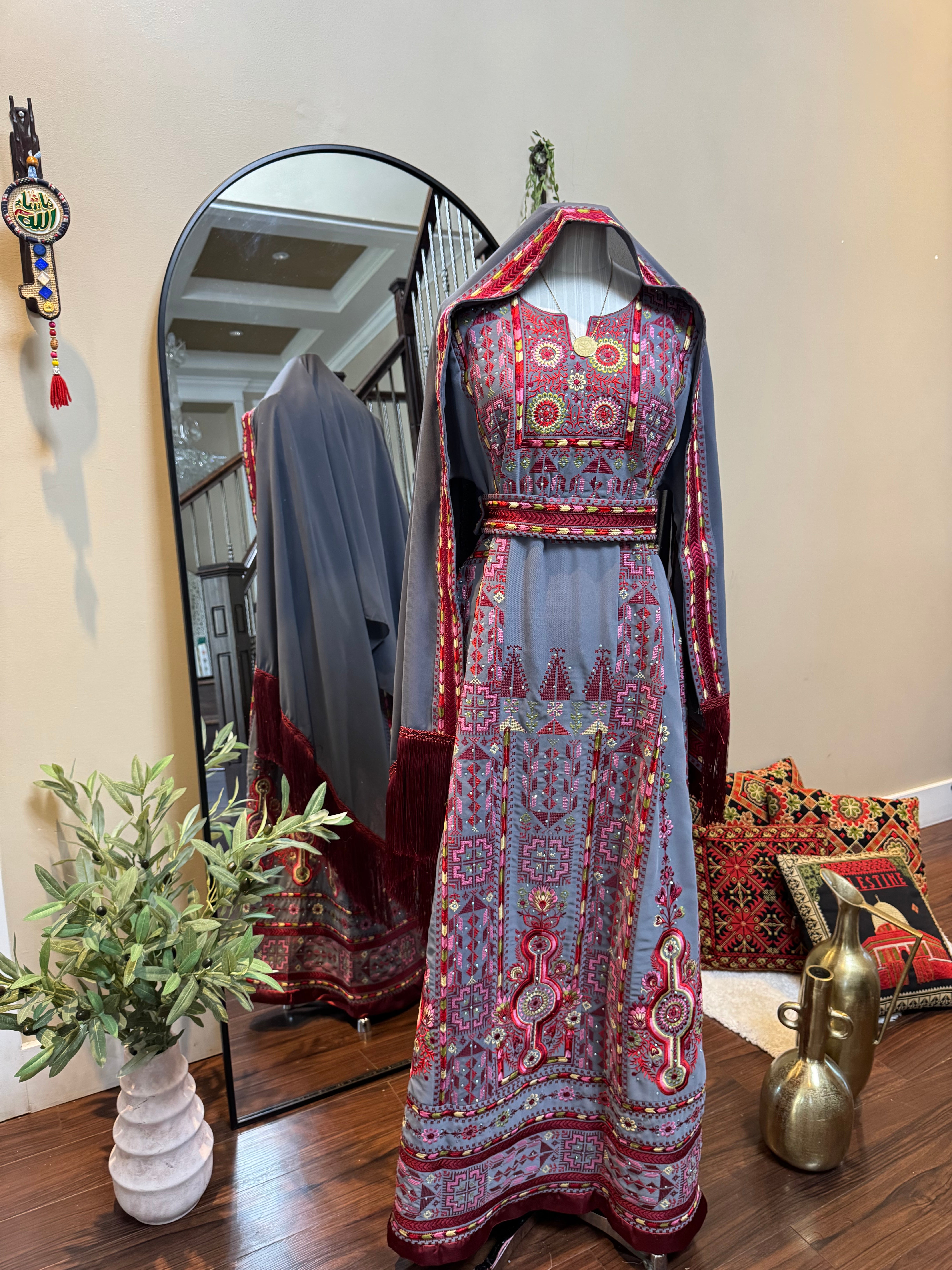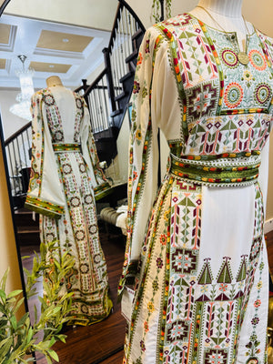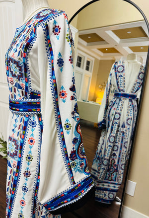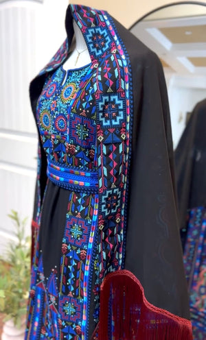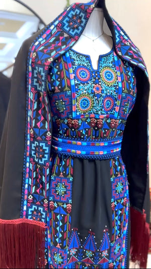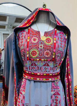 A fully embroidered Palestinian thobe designed to reflect elegance and cultural heritage. This exquisite piece includes a matching headscarf and belt to complete the look.