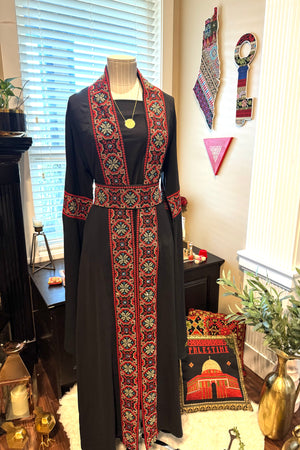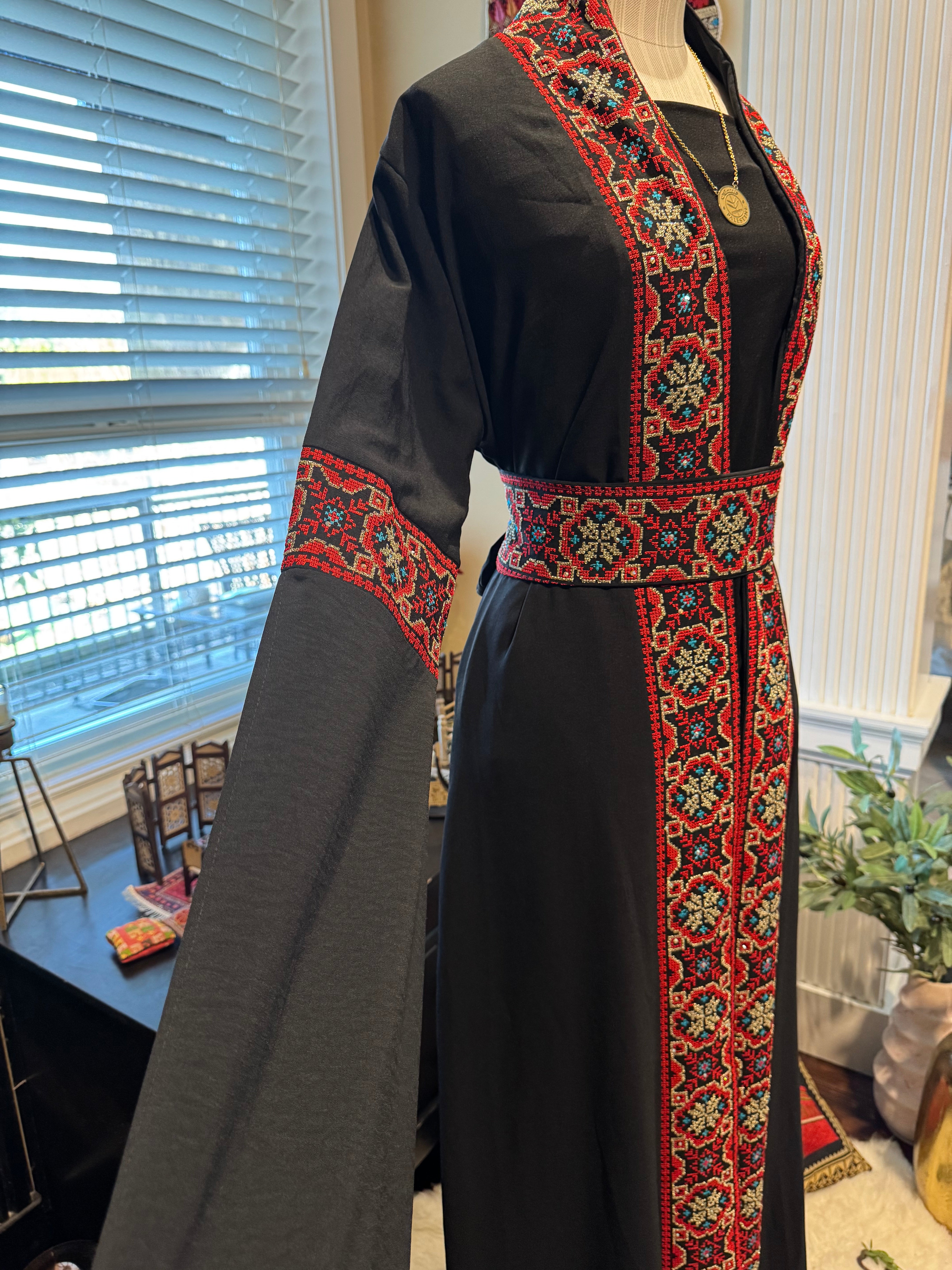 Elevate your wardrobe with the exquisite “Wattan” abaya, a masterpiece of style and tradition. Crafted from premium black fabric, this open-front abaya features stunning Palestinian embroidery in vibrant red with hints of blue and gold, delicately accented with rhinestones for a subtle sparkle. The long, Turkish Ottoman-style sleeves add a touch of sophistication, while the matching embroidered belt enhances the overall elegance and provides an adjustable fit.
