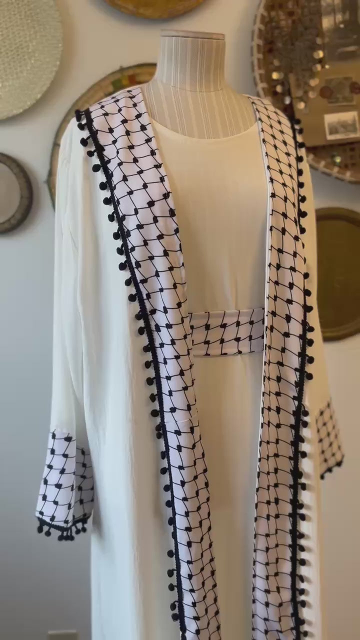 Embrace timeless elegance with Koffiyeh Open Abaya, a perfect blend of tradition and contemporary style. Crafted from high-quality fabric, this stunning open-front white abaya is beautifully accented with the iconic Koffiyeh pattern along the front and sleeves. A matching Koffiyeh-patterned belt enhances the look, adding a touch of tradition and elegance.