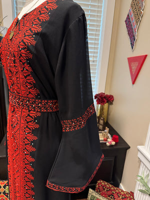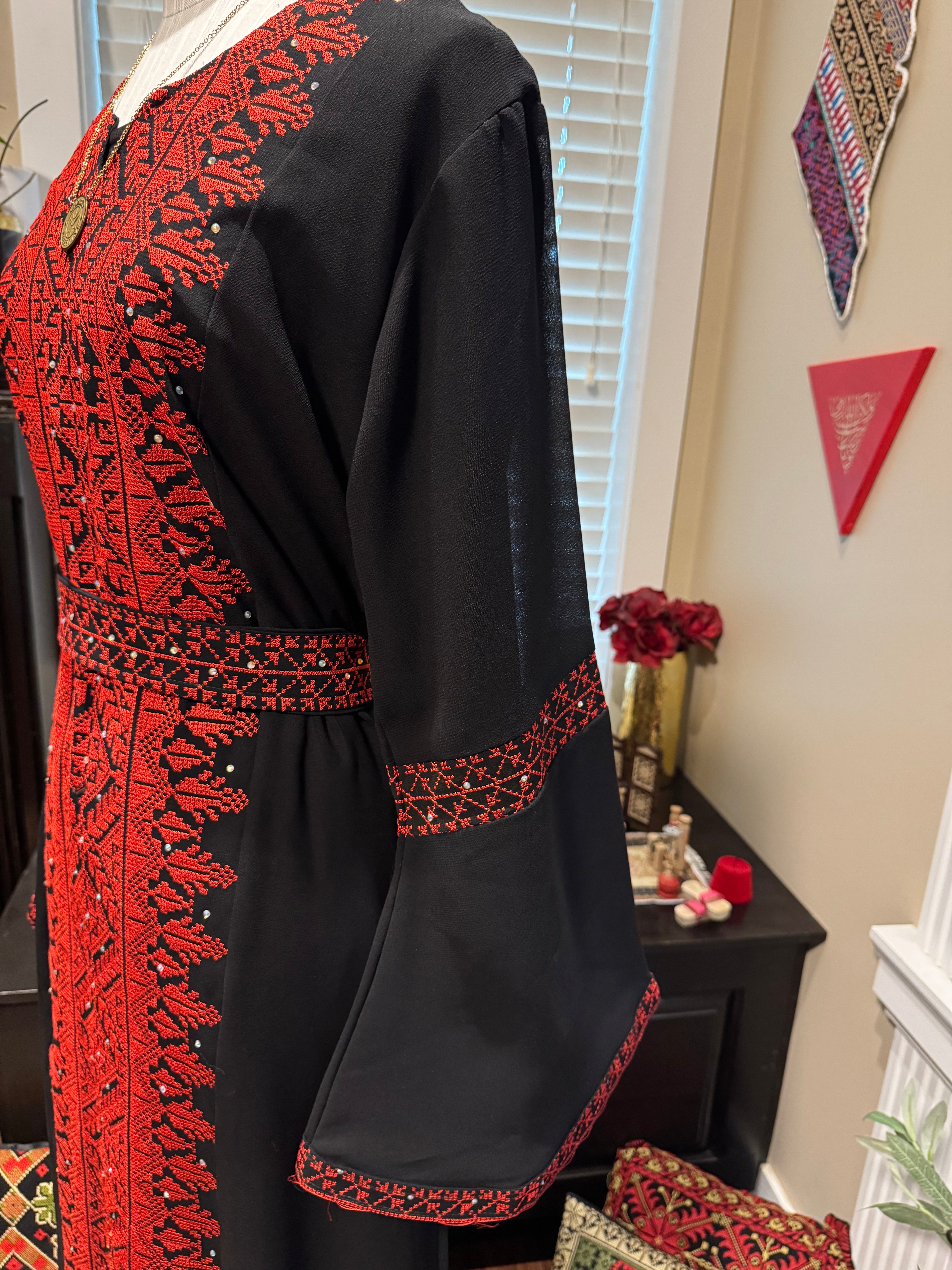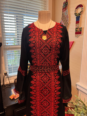 Stunning Thobe Yashmak -ثوب يشمك- is adorned with our beautiful Henna Collection. The black dress with red embroidery design is inspired by traditional Palestinian garments. Complete with a black under piece, this thobe is the perfect combination of elegance and tradition.