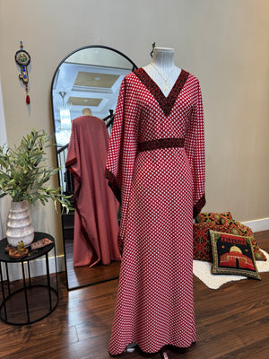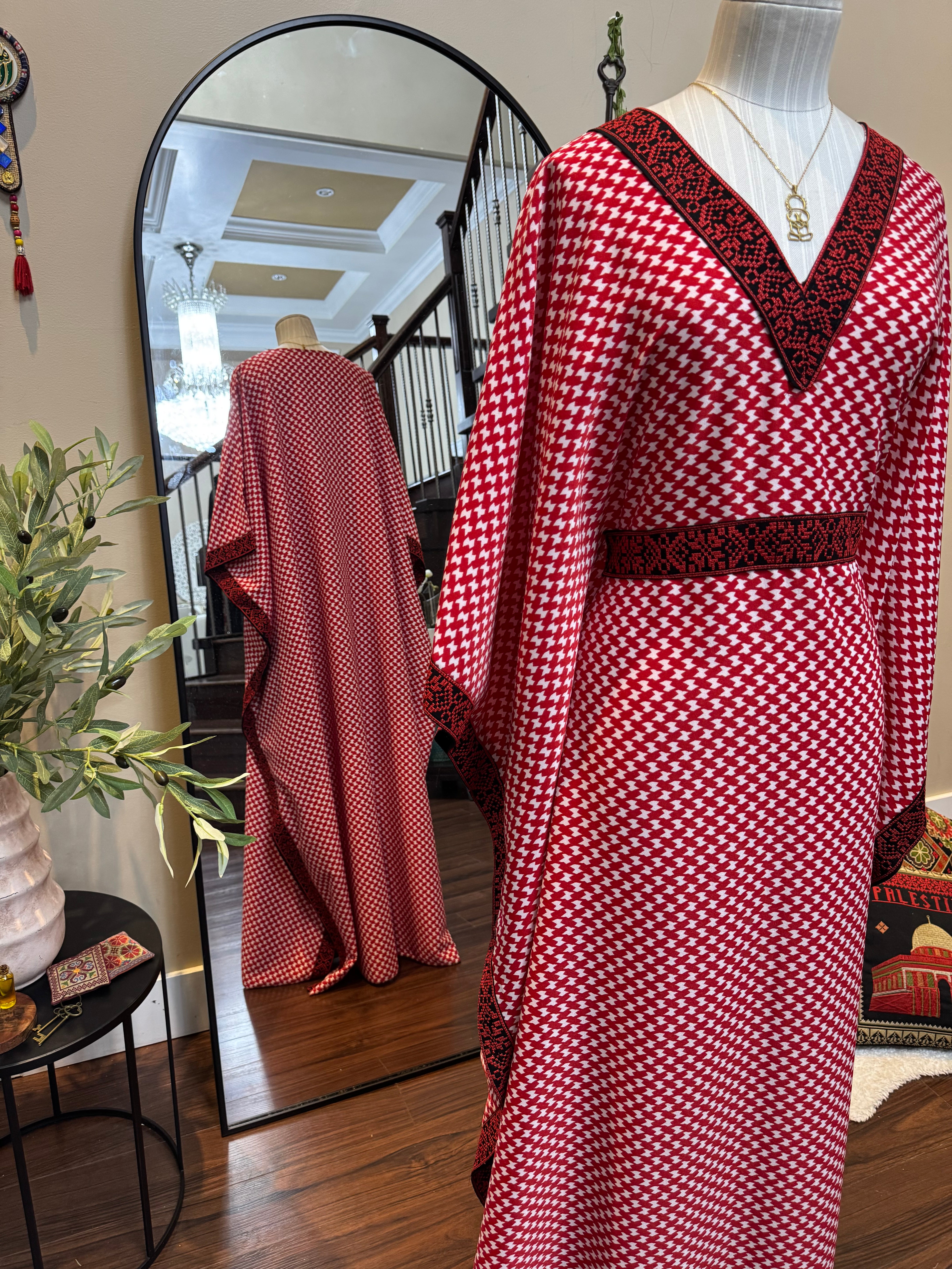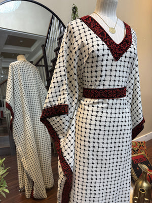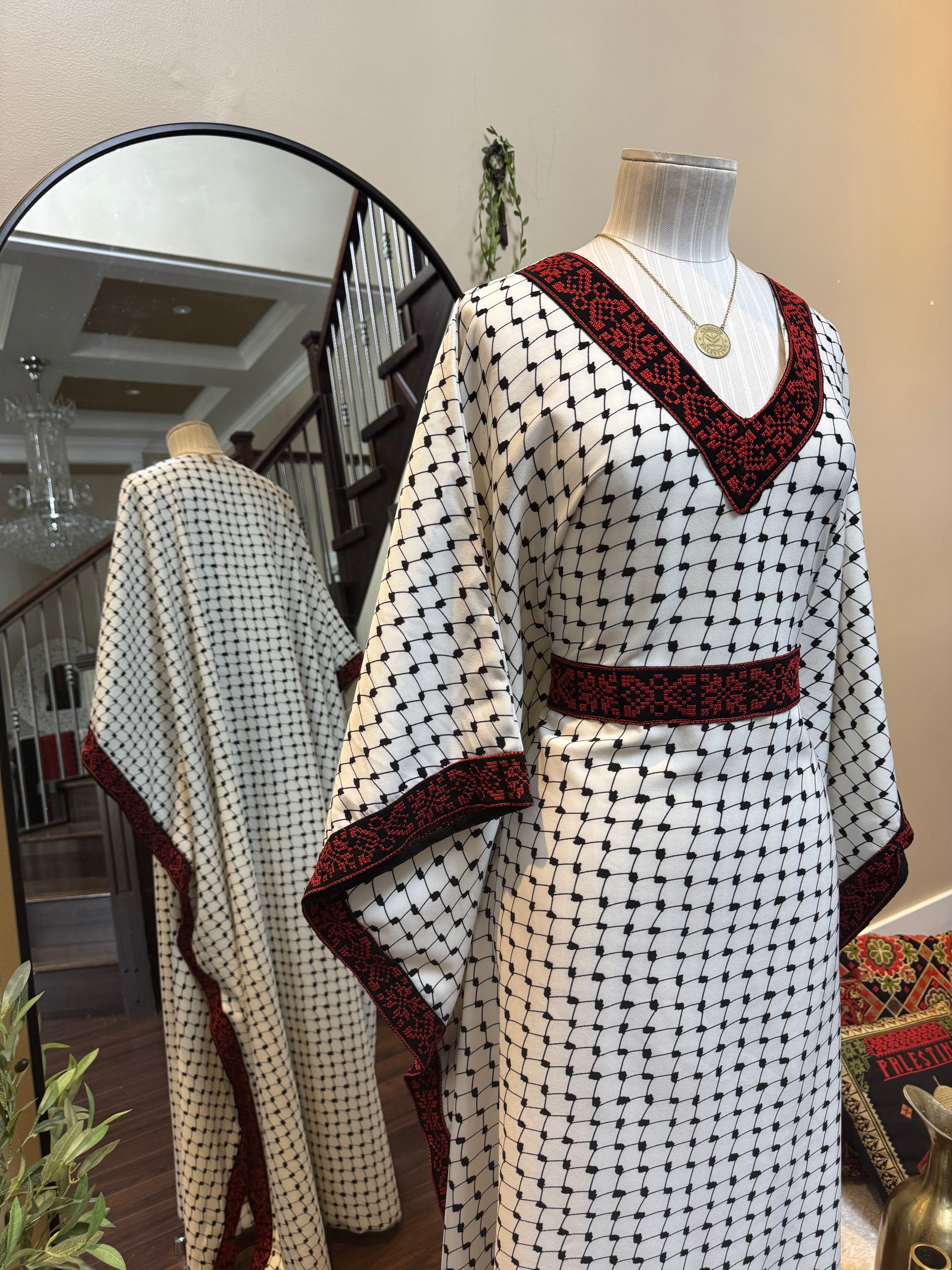 Discover the elegance of our “Butterfly” Koffiyeh ِAbaya, crafted from high-quality red and white Koffiyeh fabric and adorned with striking red embroidery. This Abaya features a traditional Palestinian design, bringing timeless charm to your wardrobe. It comes with an inner matching belt that can be fastened from the inside, allowing you to adjust the fit for a more personalized look.