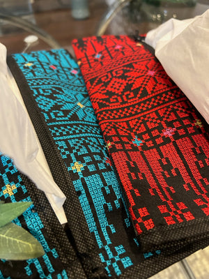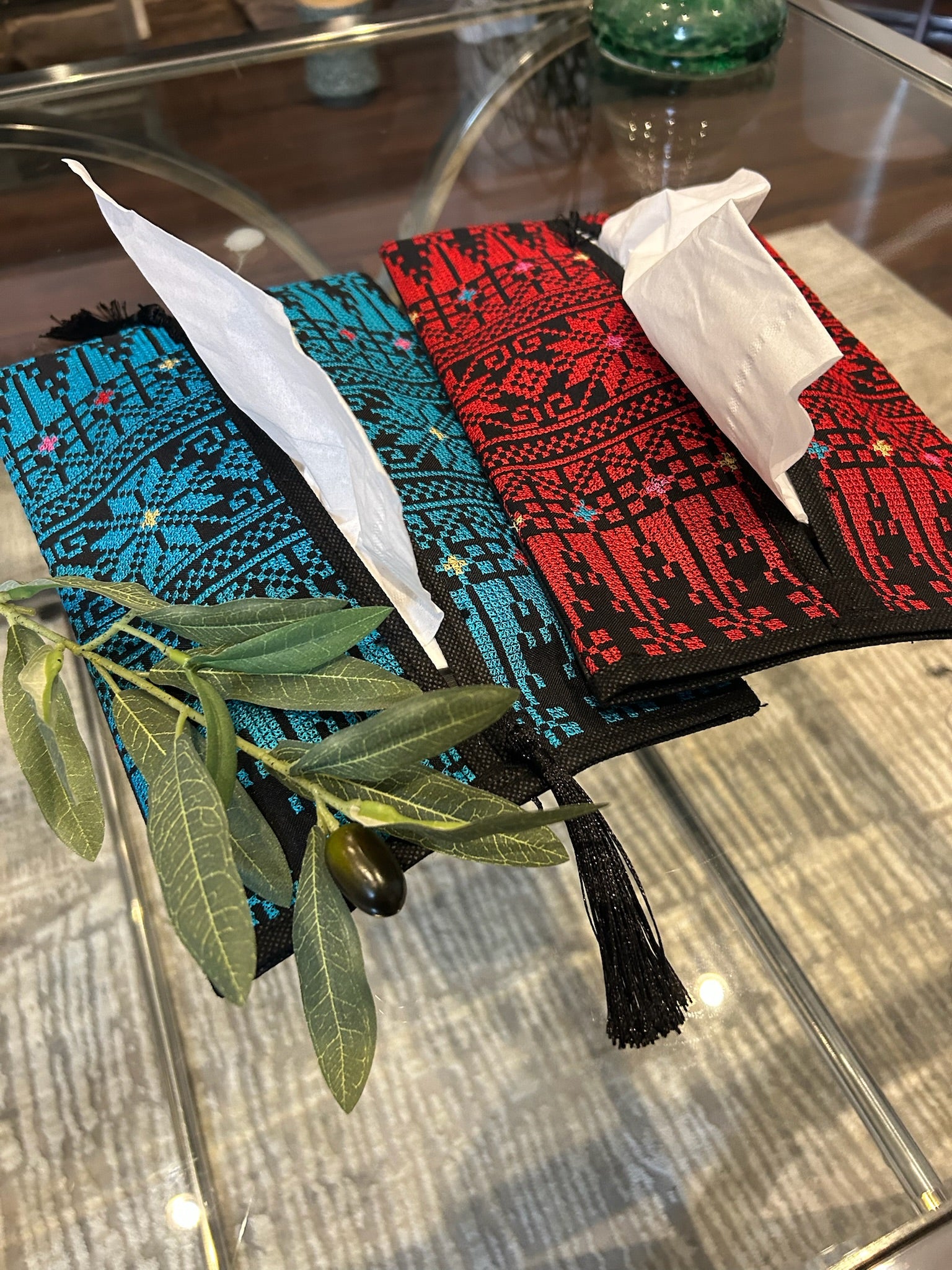 Add a touch of heritage to your living room with this beautifully embroidered tissue's case . Featuring traditional Palestinian embroidery in vibrant colors, this brings culture and elegance to any space.