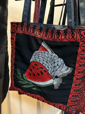 Show your love for Palestine with our high quality fabric and crafted Tatreez Watermelon Tote Bag . Featuring a beautiful vibrant design, with zipper and back pocket. This stylish tote is a celebration of Palestinian heritage and artistry. Perfect for everyday use with a meaningful touch!
