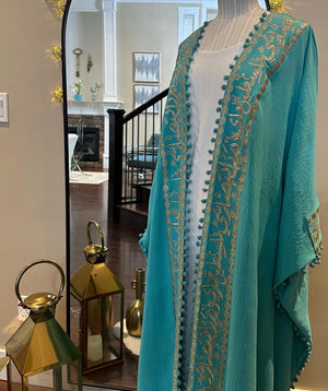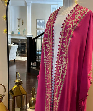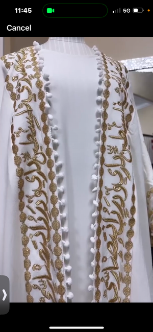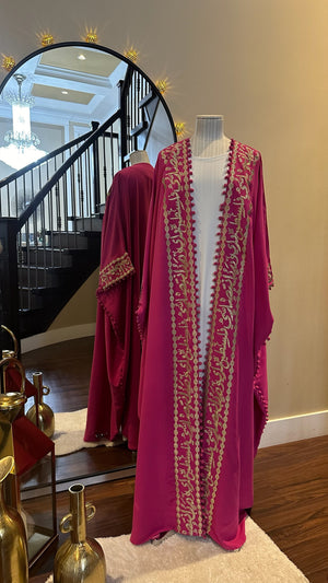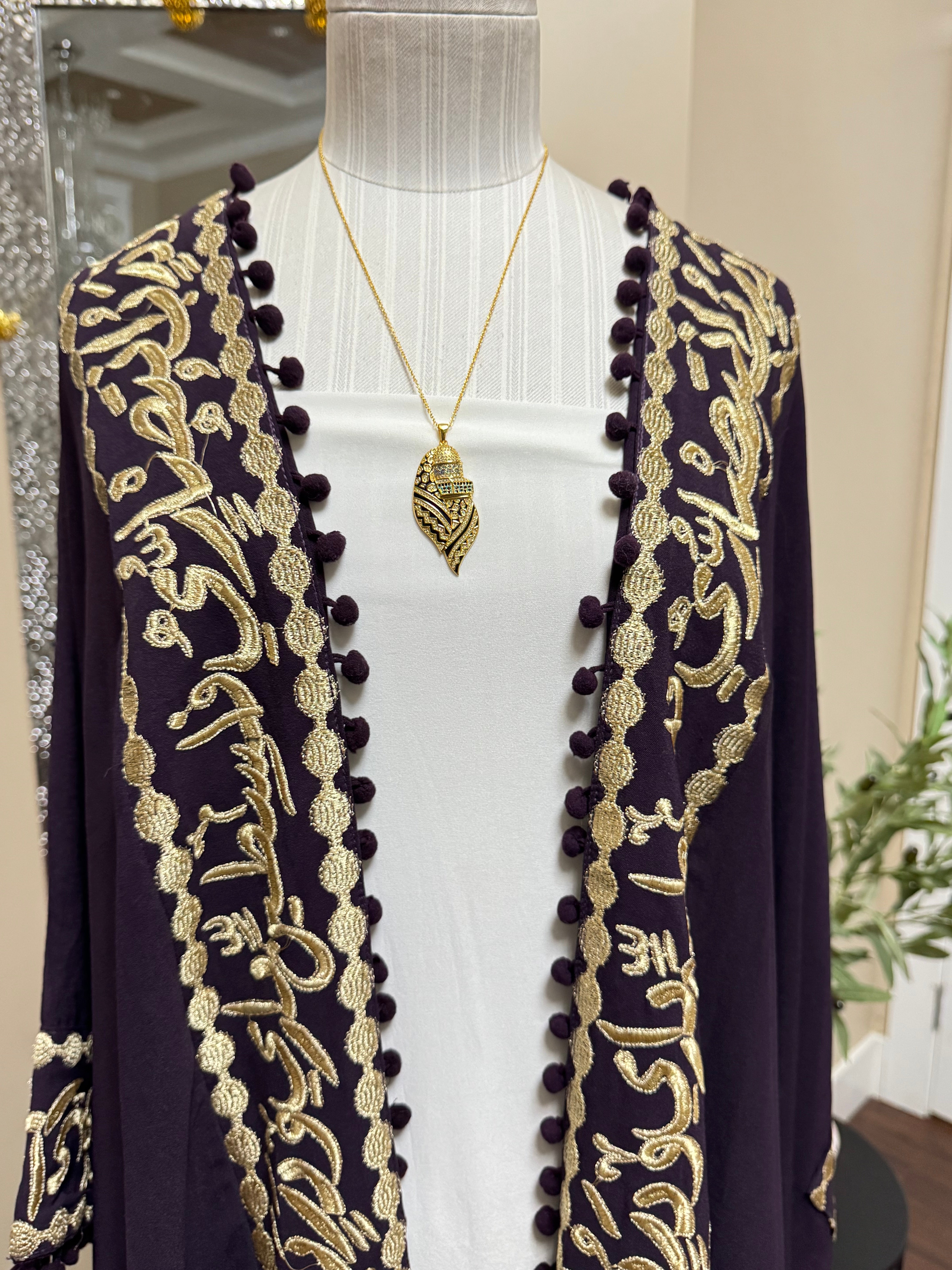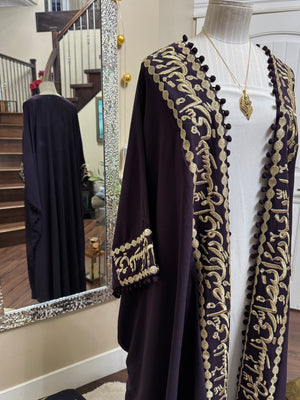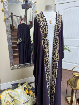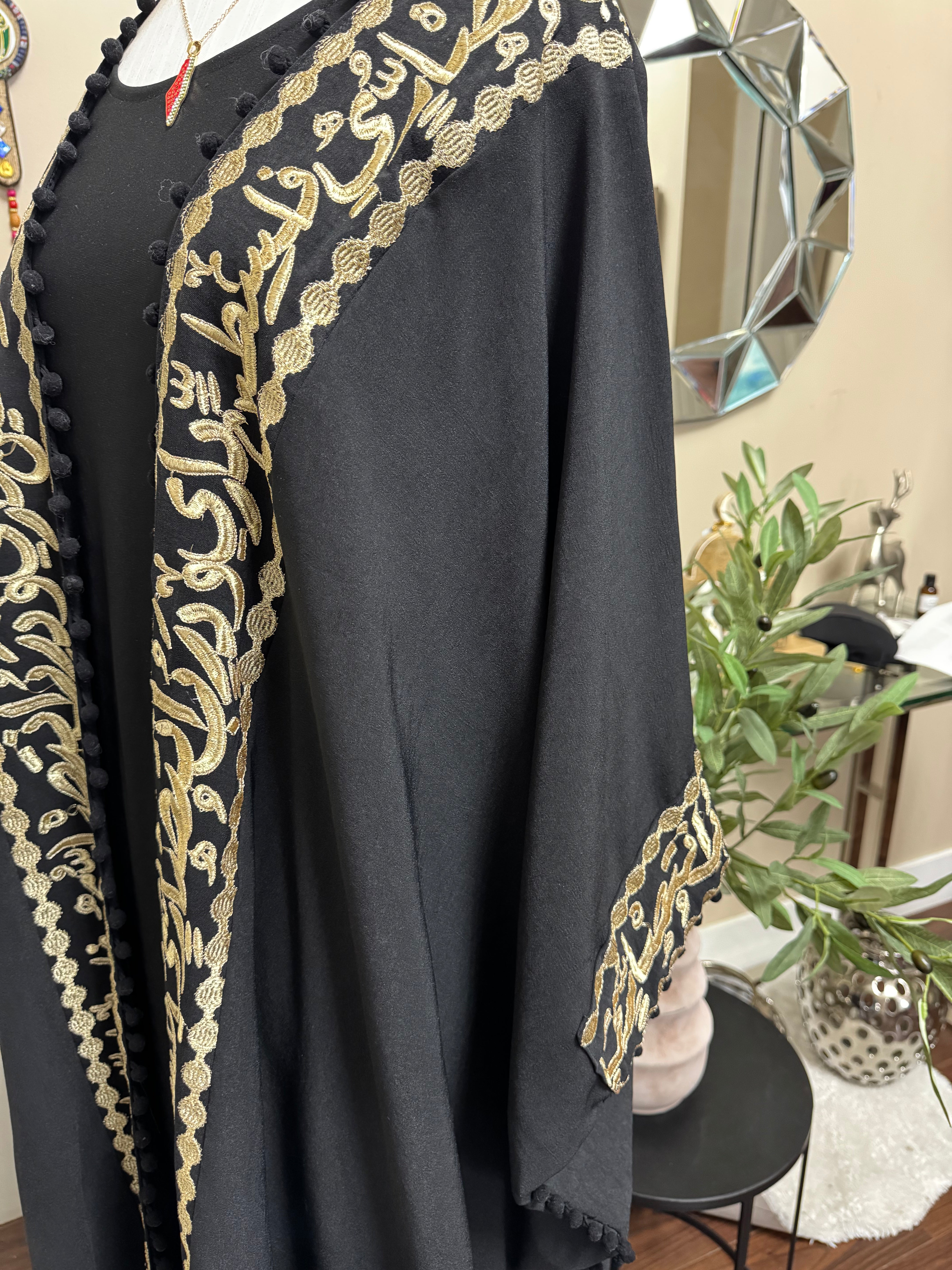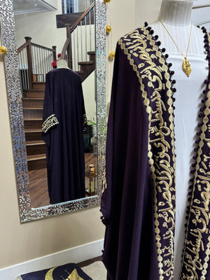 A stunning and unique abaya crafted from high-quality fabric, designed to make a statement. This exquisite piece is beautifully embroidered on the front and sleeves with golden MDC threads, adding a touch of elegance and tradition.