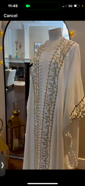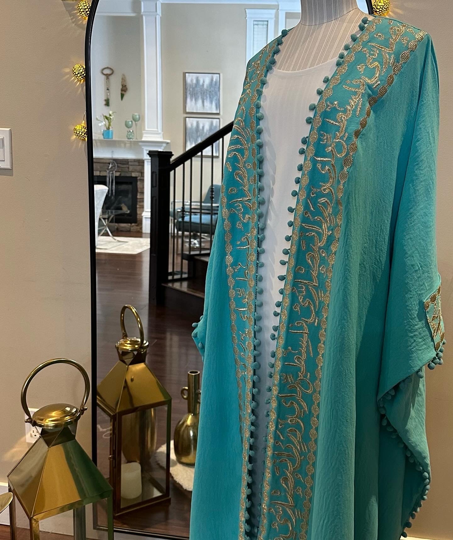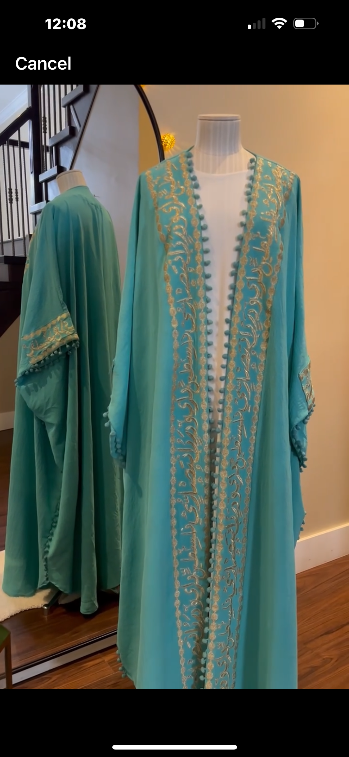 What makes this abaya truly special is the powerful quote from the famous Palestinian poem “فلسطينُ داري”, which reads: