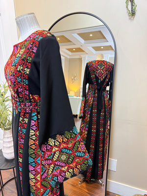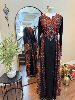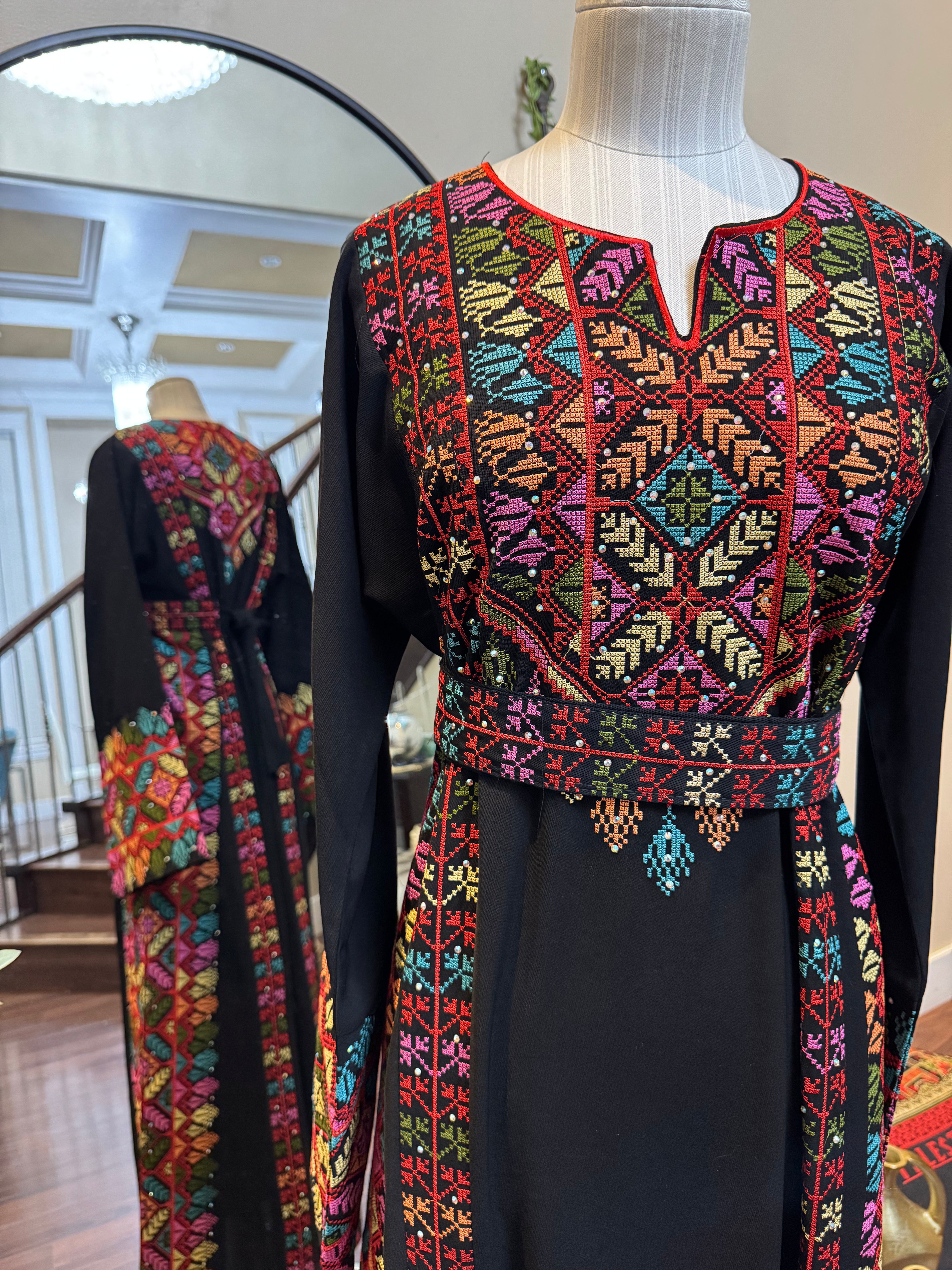 A refined black Thobe featuring geometric and heritage patterns in calm tones. Embroidered semi-manually with premium DMC threads, it reflects Jaffa’s elegance and cultural depth.