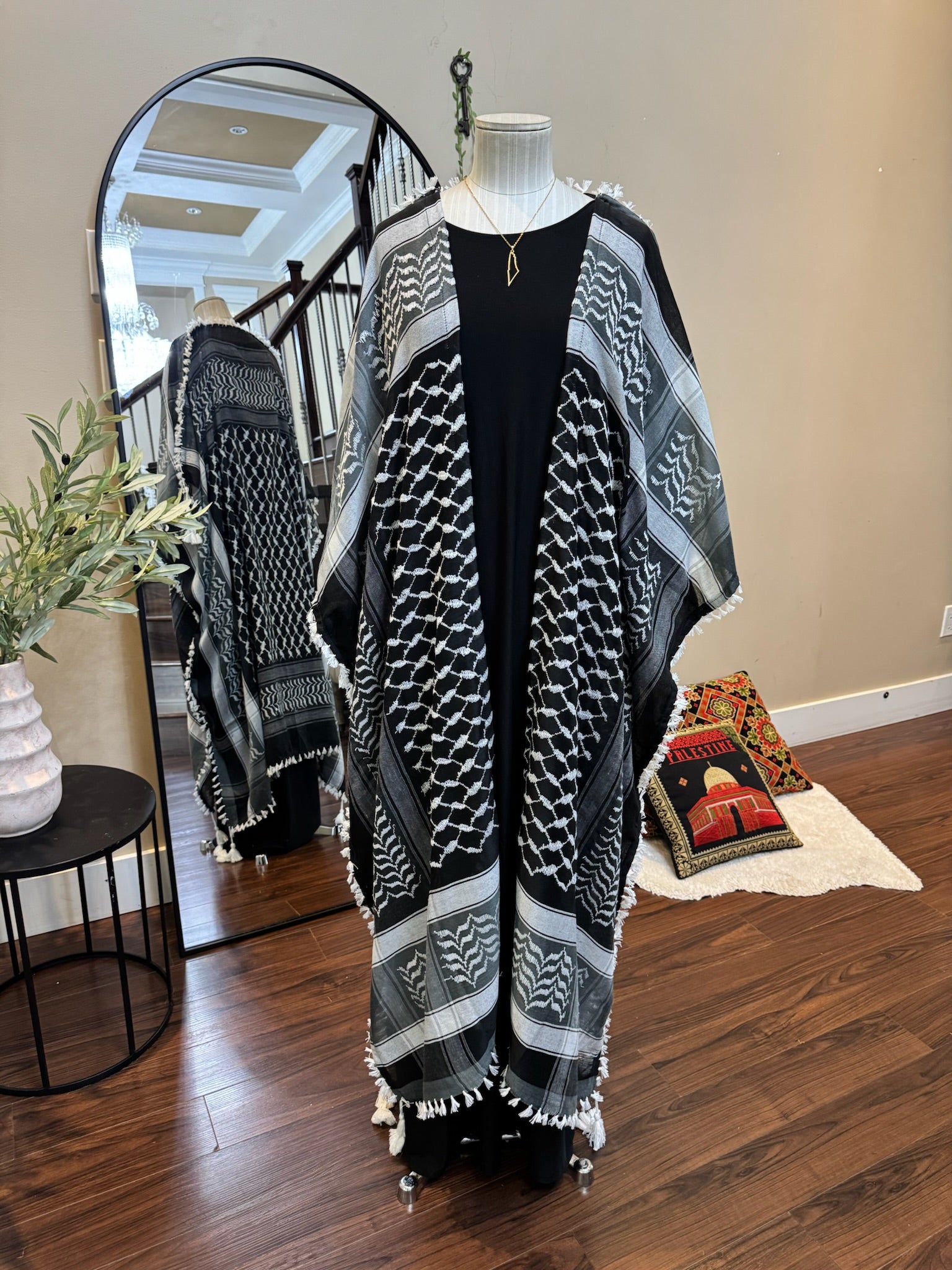 Elevate your style with this Long Koffiyeh (Bisht), a timeless symbol of Palestinian heritage, identity, and resistance. Designed for all sizes, this elegant piece is perfect for everyday wear and special occasions. Made from high-quality fabric, it drapes beautifully, offering both comfort and cultural significance.
