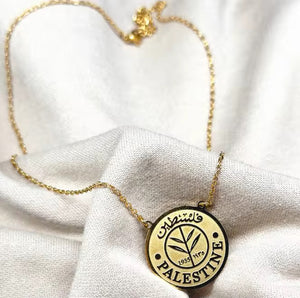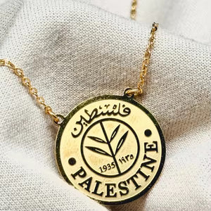 This gold-tone necklace is designed to resemble an old Palestinian coin, beautifully engraved with the word “Palestine” in both Arabic and English, along with a timeless olive branch symbol and the years 1935. The olive branch represents peace and resilience, making this necklace a powerful reminder of heritage and identity.