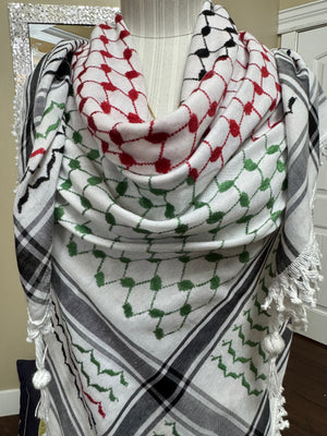 Embrace tradition with our original Palestinian Koffiyeh, beautifully woven (not printed) with high-quality craftsmanship and heavy tassels. It is unique designed in the Pal. flag color, Perfect for everyday wear or special occasions, this iconic piece symbolizes heritage and pride. Wear your koffiyeh proudly wherever you go!