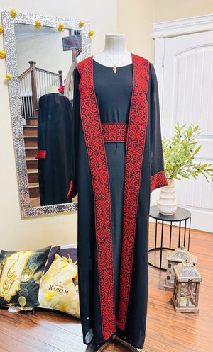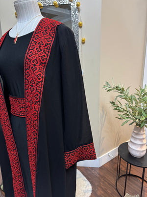 Elegant, timeless, and deeply rooted in tradition, the Rose Embroidered Abaya is a stunning celebration of Palestinian heritage. Crafted from flowing black fabric, this abaya features intricate hand-stitched red embroidery inspired by the traditional tatriz motif of blooming roses—a symbol of resilience, beauty, and love for the land.