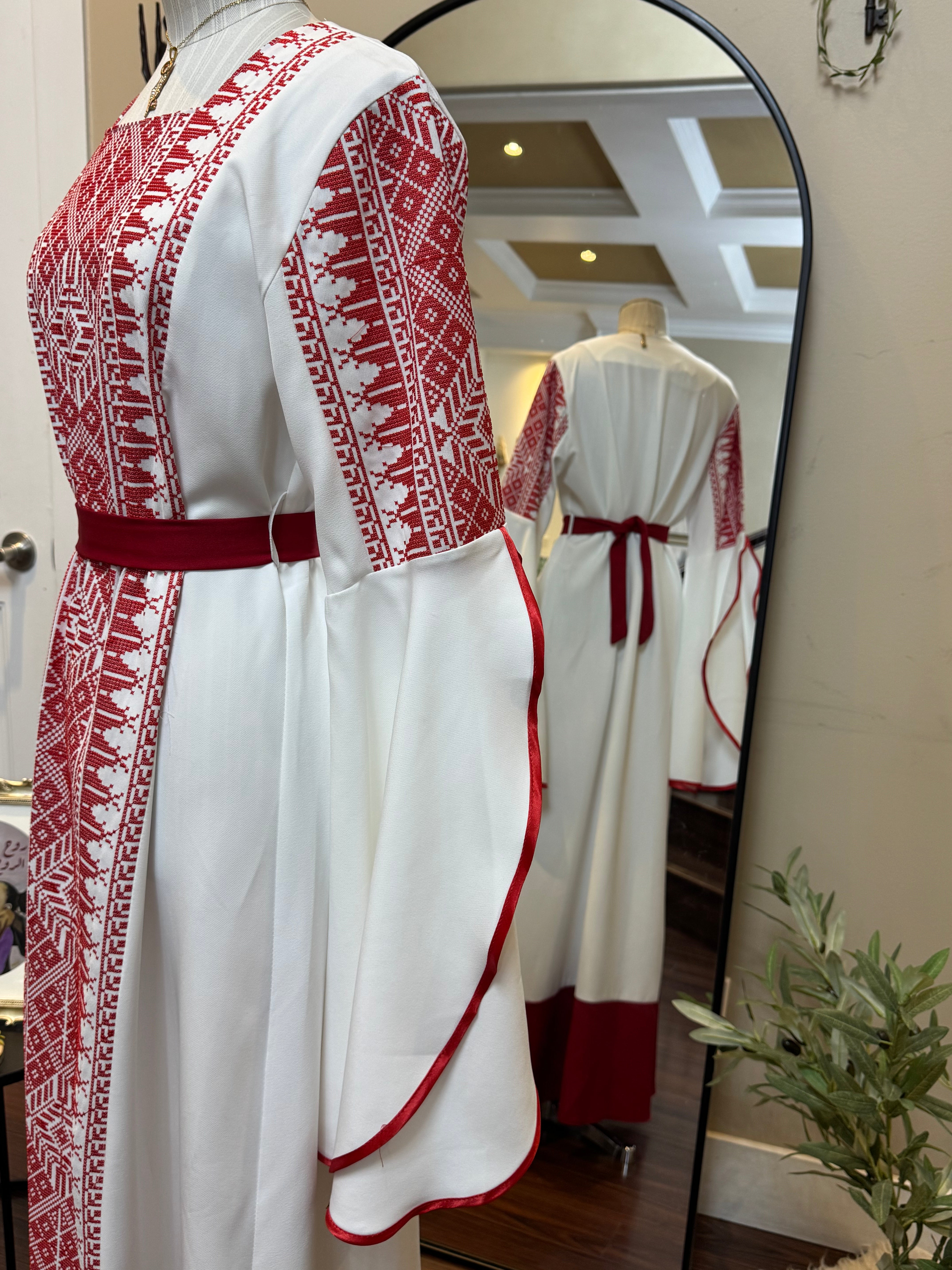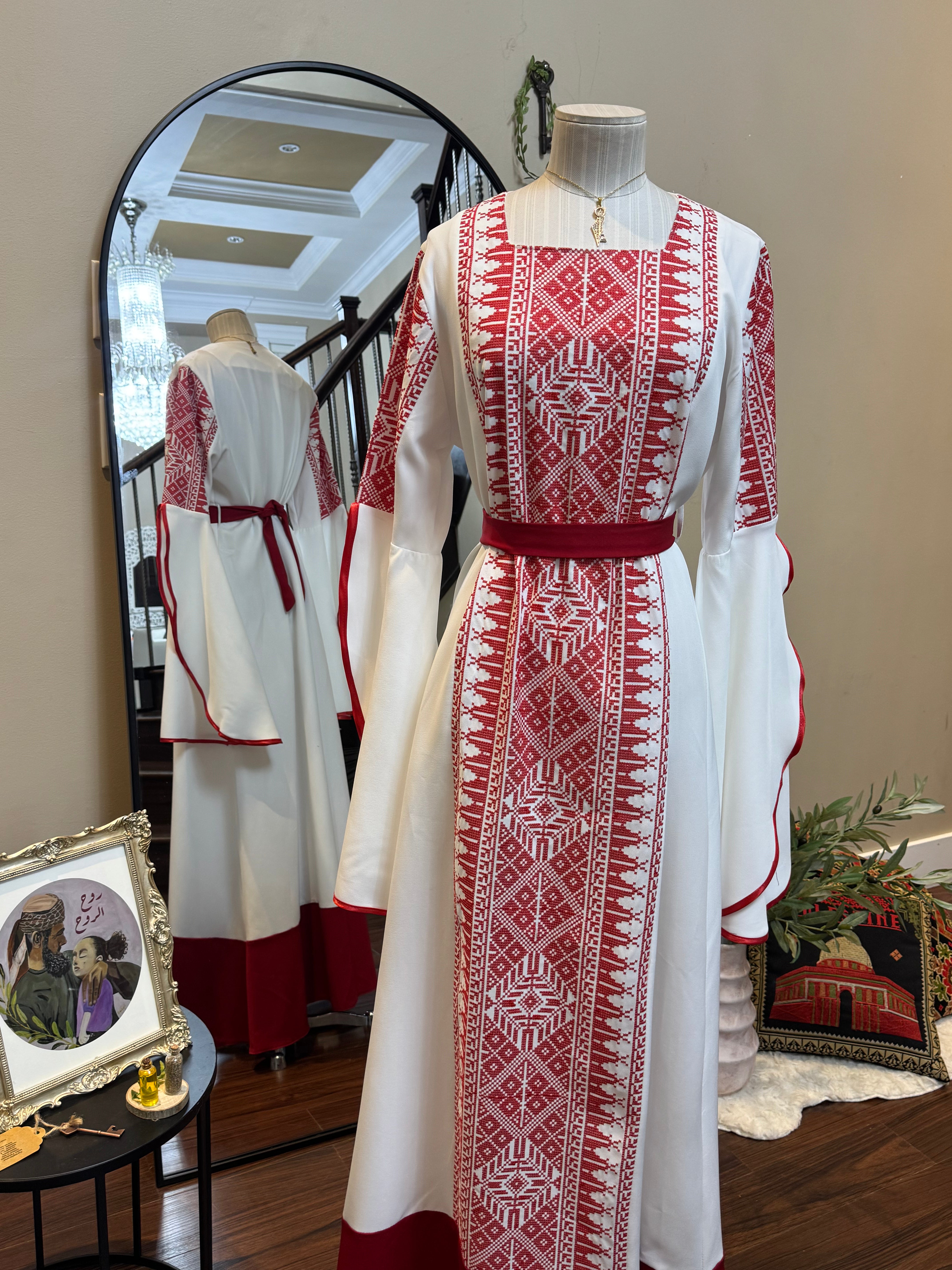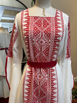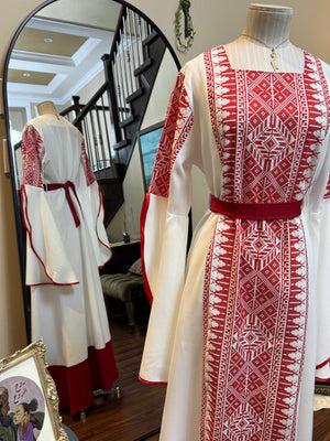Step into heritage with this traditional Ramallah thobe — a stunning white dress adorned with intricate red embroidery.